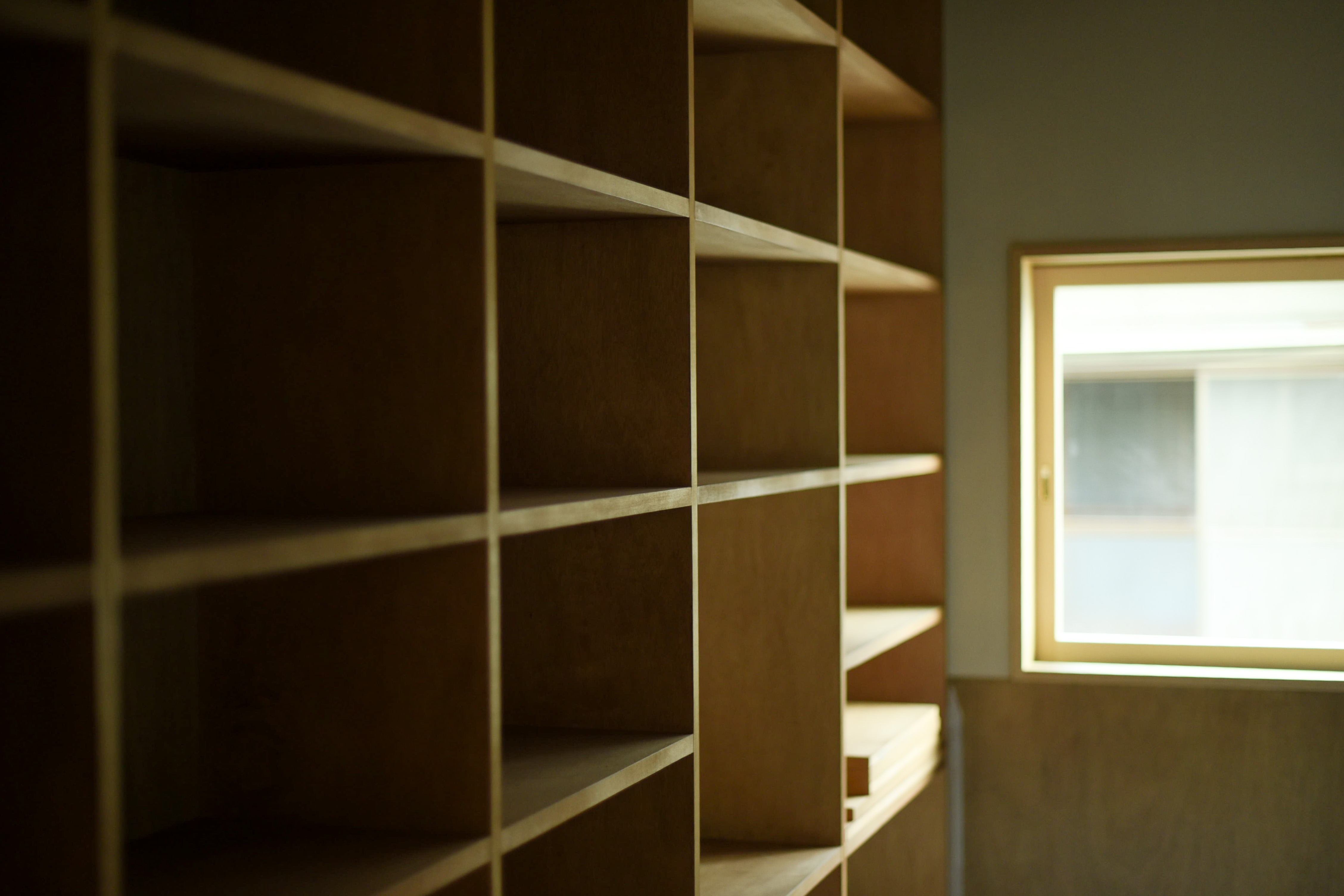 リビングには壁一面の本棚が広がり、天井と本棚には尾道の柿渋が塗られています。深みのある色合いが空間にやわらかな陰影を生み出しています。